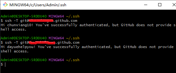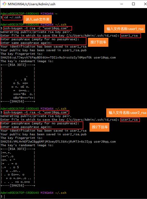 Git Bash Here进入Git Bash,然后进入.ssh文件夹,生成SSH KEY。# 进入.ssh文件夹 cd ~/.ssh # 生成user1的SSH KEY ssh-keygen -t rsa -C "[email protected]" # 生成user2的SSH KEY ssh-keygen -t rsa -C "[email protected]" -