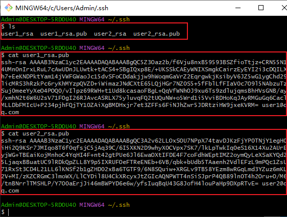 ls命令查看生成的4个密钥文件。使用cat命令查看公钥# 查看文件列表 ls # 查看公钥 cat user1_rsa.pub cat user2_rsa.pub -