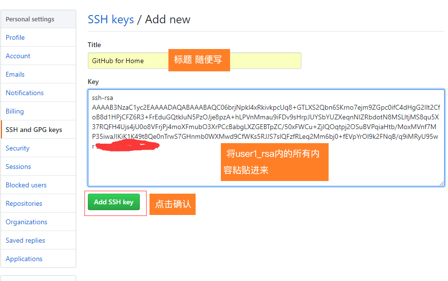 复制公钥,分别粘贴到对应的github的SSH key页面