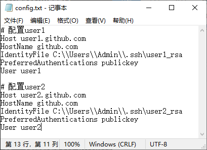 config.txt文件,每个账号配置一个Host节点。# 配置user1 Host user1.github.com HostName github.com IdentityFile C:\\Users\\lingh\\.ssh\\id_rsa PreferredAuthentications publickey User user1 # 配置user2 Host user2.github.com HostName github.com IdentityFile C:\\Users\\lingh\\.ssh\\id_rsa2 PreferredAuthentications publickey User user2 -
